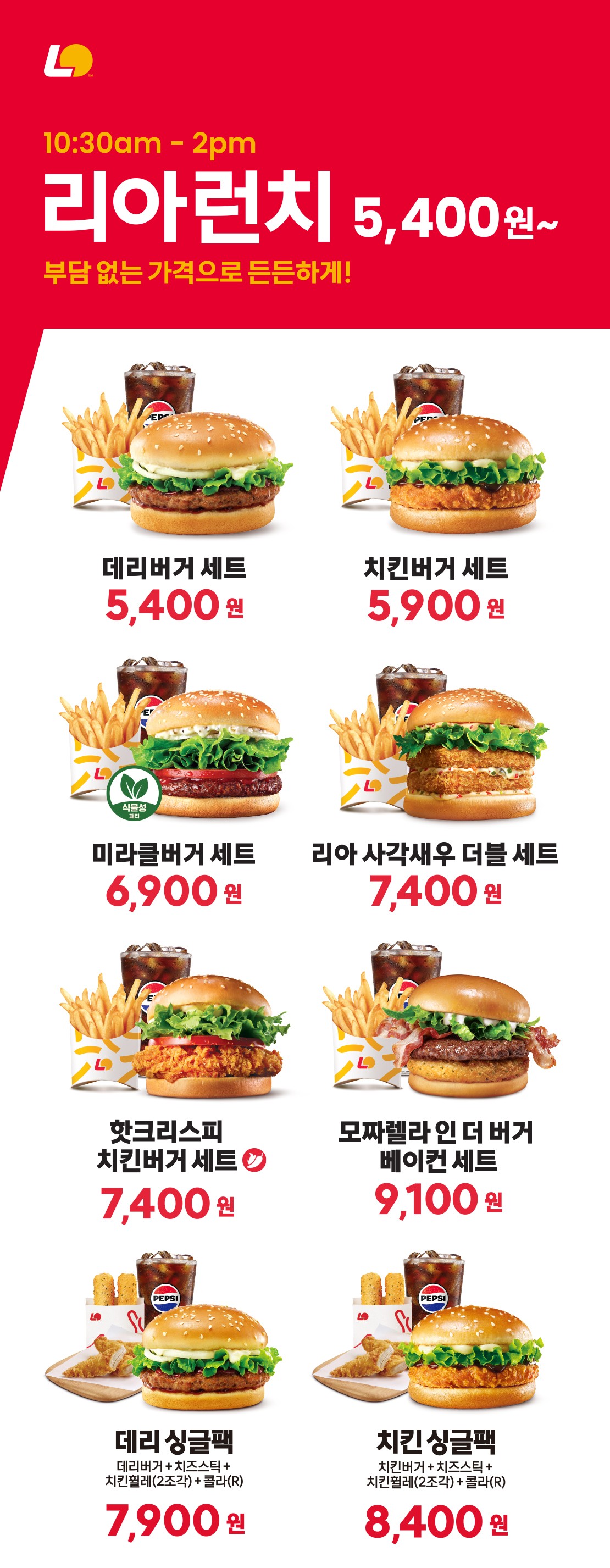 롯데리아는 오전 10시 30분부터 오후 2시까지 8가지 세트 메뉴를 할인하는 '리아 런치' 행사를 진행한다. 일부 매장은 제외될 수 있다.
