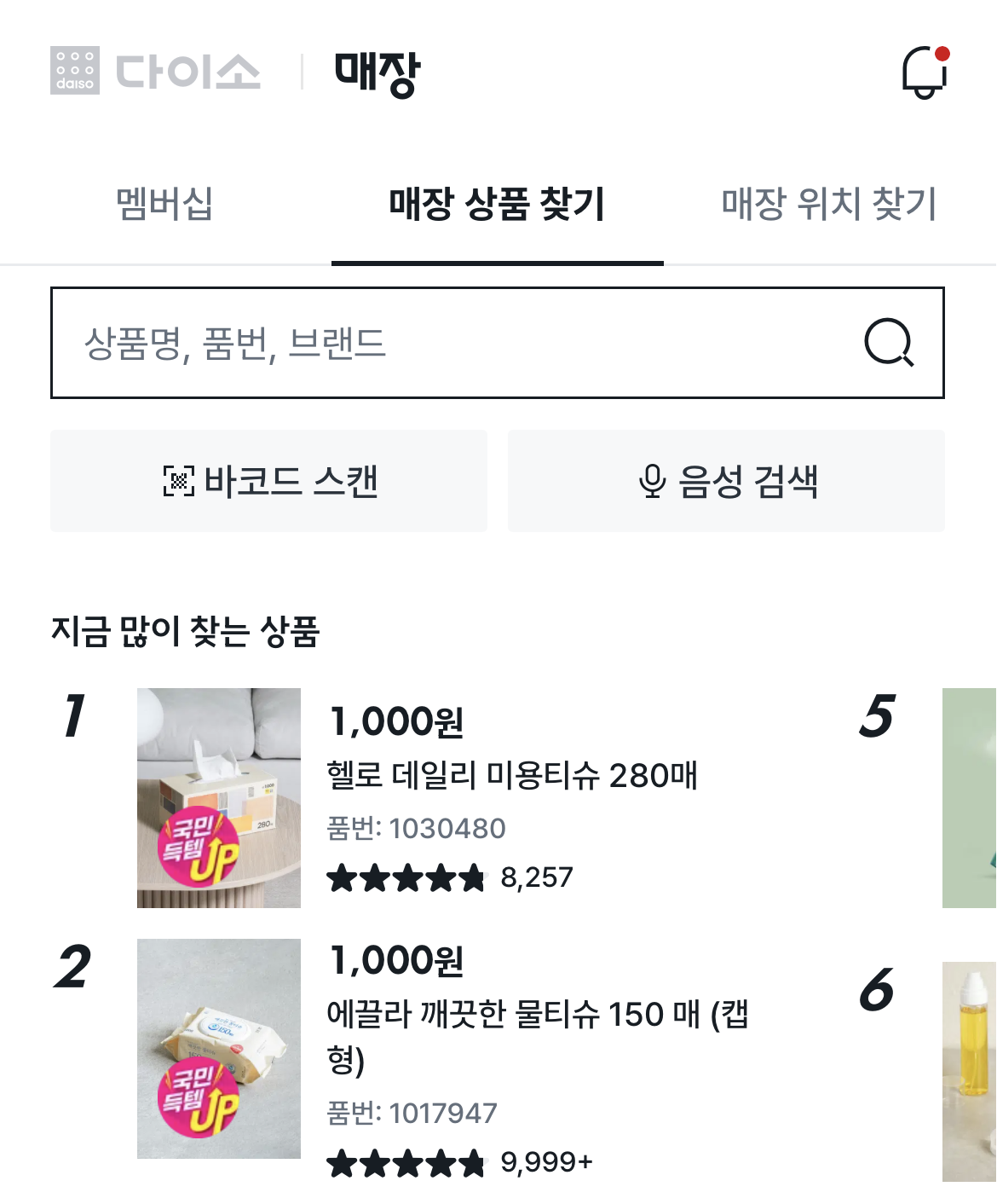 다이소 어플 '매장'탭의 '매장 상품 찾기'에서 원하는 제품의 매장별 재고 현황을 확인할 수 있다.